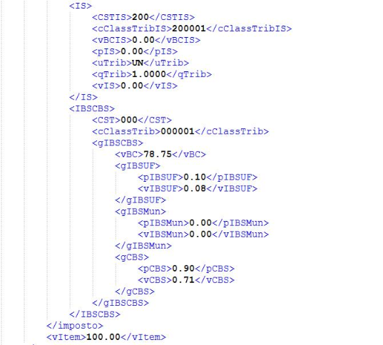 * Modelo com valores fictícios do novo XML da Nota Fiscal da Reforma Tributária que passará a valer em janeiro de 2026.